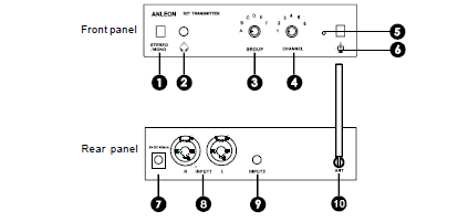 3-Perilla de grupo: Seis grupos de A a F que cooperan con el CANAL para configurar la frecuencia del transmisor.