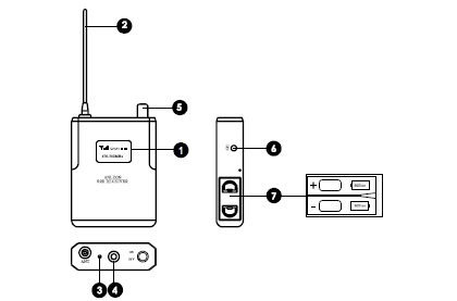 2-Salida para auriculares: Conector de 3.5 mm que permite monitorizar la señal de audio en el transmisor.